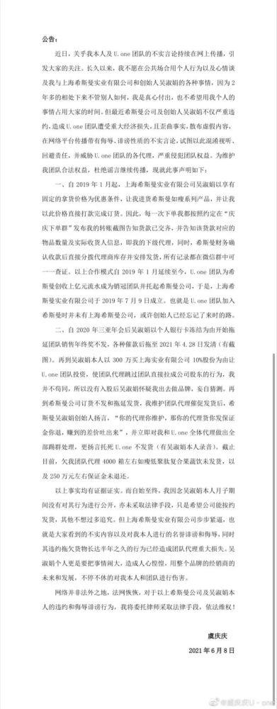 6月8日,U.one团队长虞庆庆在其个人微博同样发布了一份公告。