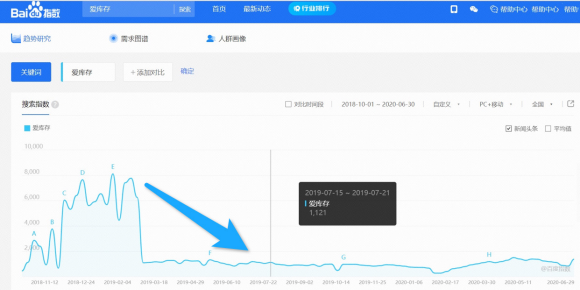 以百度指数为例,爱库存在2019年2月份百度搜索指数达到8000,与爱库存的鼎盛时期相符,不过数据在2019年3月初便出现断崖式下滑,并一直处于一个低迷的状态。
