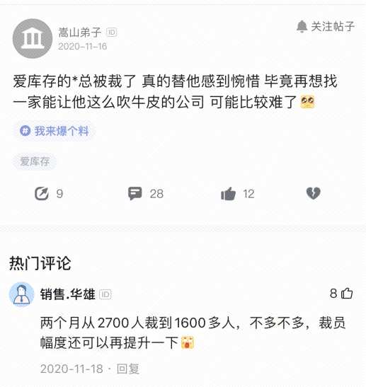 据职场平台脉脉职言爱库存员工透露,据不完全统计,从2019年开始,爱库存每次人员动荡人数高达数百人,一爱库存员工表示“刚入职一个月,就收到了11封人事变动”,“试用期裁人”“裁员按秒计算”“不推荐入职”……内部管理混乱,或许进一步加剧了爱库存业绩下滑的局面。