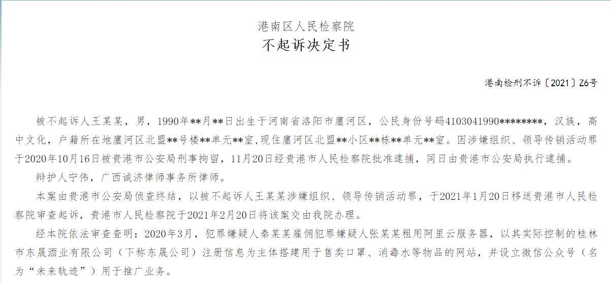 被不起诉人王某某,男,1990年出生于河南省洛阳市,汉族,高中文化,户籍所在地廛河区。因涉嫌组织、领导传销活动罪于2020年10月16日被贵港市公安局刑事拘留,11月20日经贵港市人民检察院批准逮捕,同日由贵港市公安局执行逮捕。