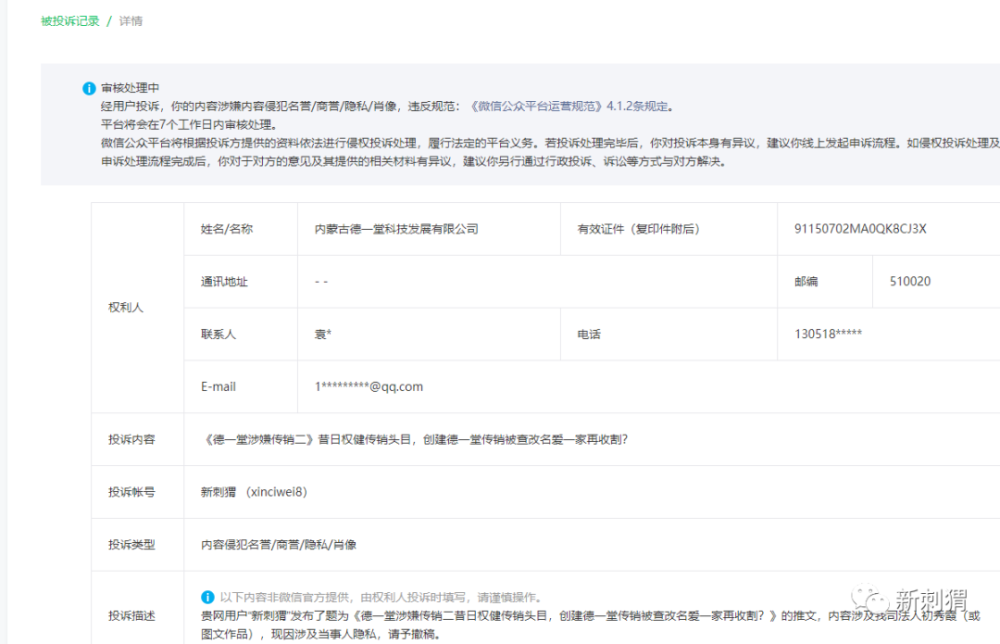 近日本网曝光了德一堂涉嫌传销被冻结期间再起新盘继续开展传销活动的行为。曝光后近日德一堂聘请黑公关联系本平台有偿删帖,遭拒绝后,黑公关以侵犯隐私权为由对该篇稿件进行恶意投诉。