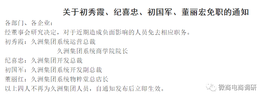 2019年年初,权健事发后,初秀霞和纪喜忠选择另谋出路,来到了久洲集团并担任高管,但好景不长,2020年1月23日,久洲集团发布《关于初秀霞等人免职的通知》,《通知》称,经董事会研究决定,对于近期造成负面影响的人员免去相应职务。其中,初秀霞的职务为久洲集团系统运营总裁、久洲集团系统商学院院长;纪喜忠为久洲集团开发总裁,自《通知》发布之日起,包括此二人在内的共计四人不再为久洲集团人员。