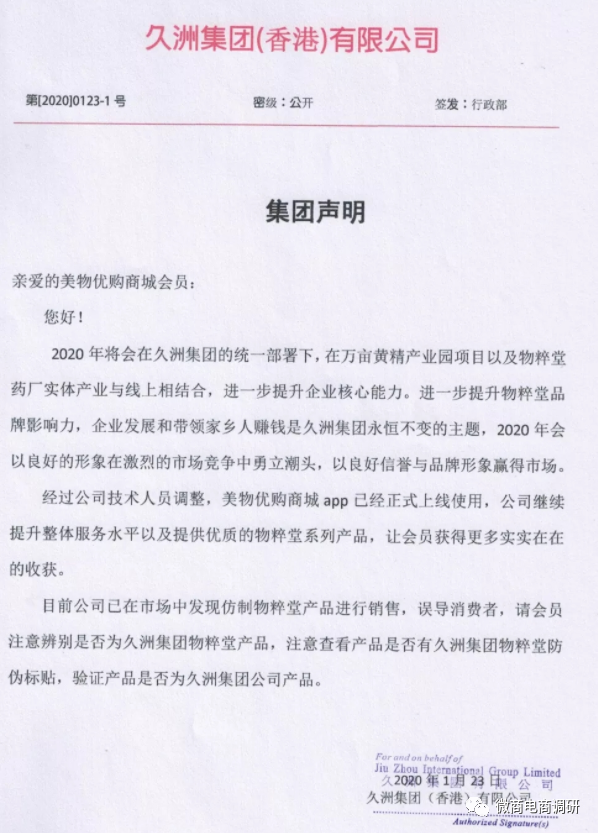 在发布这则《通知》的当日,久洲集团还发布了一则《集团声明》,《声明》称:目前公司已在市场中发现仿制物粹堂产品进行销售,误导消费者,请会员注意辨别是否为久洲集团物粹堂产品。
