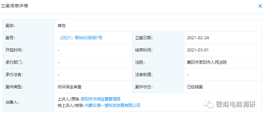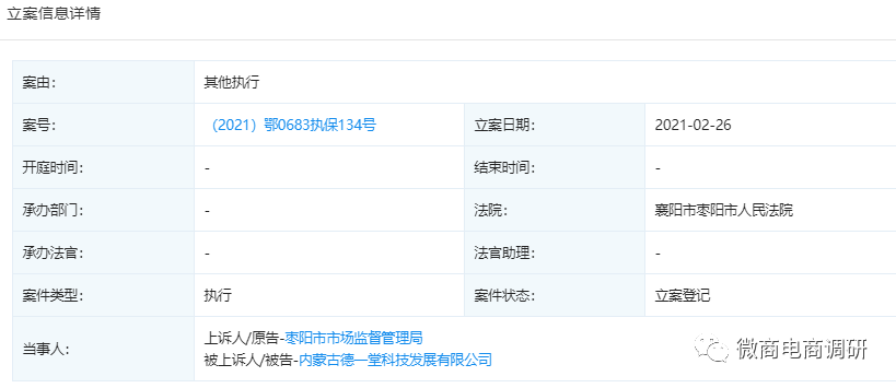 2021年2月24日和26日,《枣阳市市场监督管理局与内蒙古德一堂科技发展有限公司保全案件》、《枣阳市市场监督管理局与内蒙古德一堂科技发展有限公司执行案件》分别得以公示。