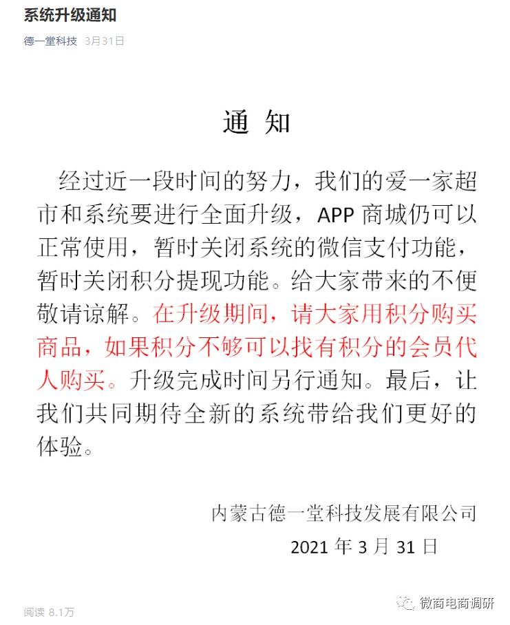 在这两场保全案件和执行案件发生的一个月后,2021年3月31日,内蒙古德一堂科技发展有限公司发布《系统升级通知》。《通知》称,爱一家超市和系统要进行全面升级,APP商城仍可以正常使用,暂时关闭系统的微信支付功能,暂时关闭积分提现功能。