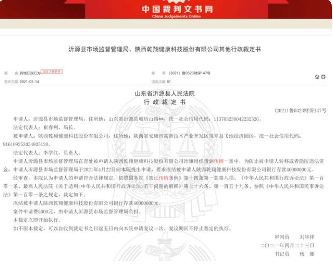 近日,中国裁判文书网公布一则题为《沂源县市场监督管理局、陕西乾翔健康科技股份有限公司其他行政裁定书》(以下简称裁定书),显示,陕西乾翔健康科技股份有限公司因涉嫌组织策划传销被法院冻结银行存款4000万元,随后因不服裁定提出复议申请,但最终被法院驳回复议。