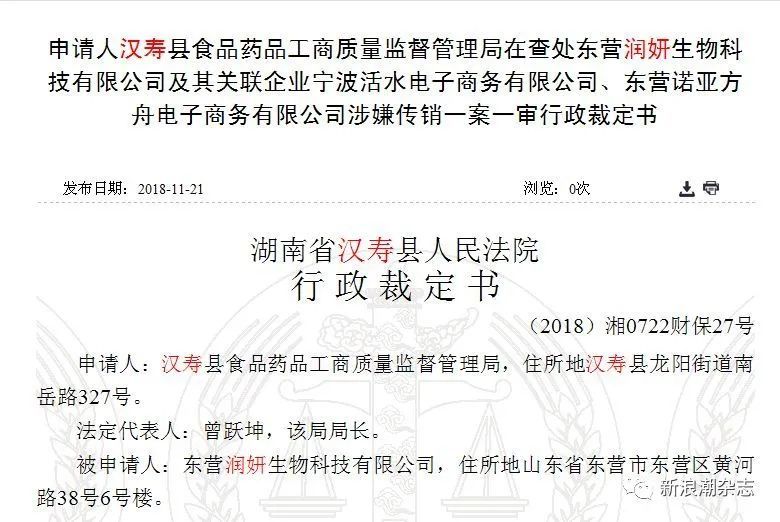 2018年10月19日,山东省滨州市滨城区政府网站公示了一则处罚决定书:东营润妍生物科技有限公司被滨州市滨城区工商局认定为运用爱润妍网上商城采取发展会员、计酬返利的传销模式销售爱润妍系列化妆品,没收违法所得8004043.00元,罚款200万元。