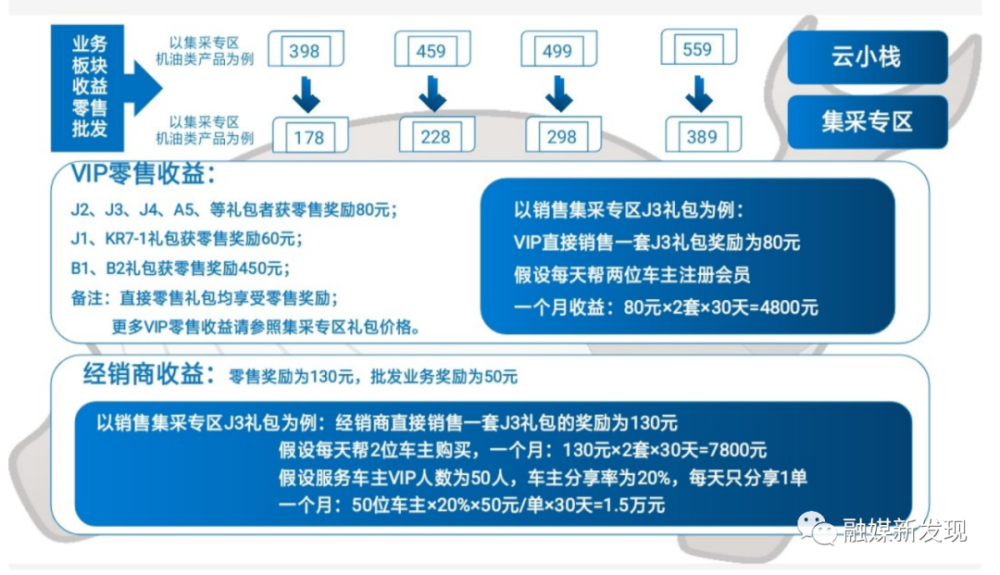 华时财讯发现关爱之家养车的团队等级分为VIP、经销商、社区服务站、区县服务中心、市运营中心、省子公司6个级别等级,每个等级晋升的要求不一样,奖励政策也不一样。要想加入该项目,获取原始股,首先得成为该项目会员也就是VIP,根据车型的价格划分,有四个档次的VIP福利包,分别为:10万左右的车178元、20万左右的车228元、30万左右的车298元、30万以上的车389元,成为会员后即可拉人头赚大钱,无地域限制,只要是扫个人二维码注册,伞下VIP在全国各地消费都有60-80元收益。