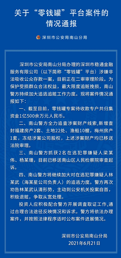6月21日,深圳市公安局南山分局发布《关于“零钱罐”平台案件的情况通报》