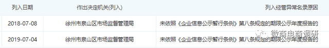说到周广,据企查查显示,与此人有所关联的公司众多,徐州成文广汇电子商务有限公司就是其中之一,周广投资的这家公司曾连续两年因未依照《企业信息公示暂行条例》第八条规定的期限公示年度报告,而被徐州市泉山区市场监督管理局列入企业经营异常名录,2020年6月该公司的营业执照被有关部门吊销。