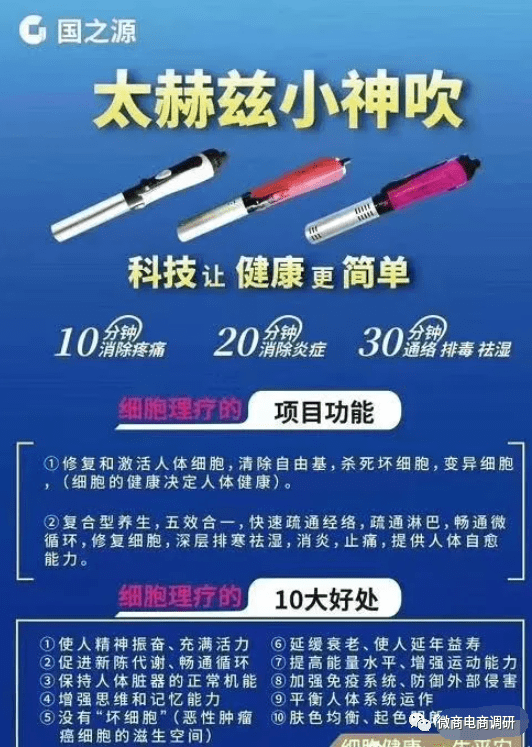 关于这款产品的宣传,有关公众号的包装可谓是无所不用其极,在由国之源推广人员所设立的公众号“大健康1234”中,太赫兹小神吹的功效被宣传为:可瞬间打通微循环,通经络,除湿寒,激活细胞,辅助减轻颈肩腿脚等疼痛,改善风湿性关节炎,强身健体,提高自身免疫力。面部提升,美容逆龄,效果也非常明显!