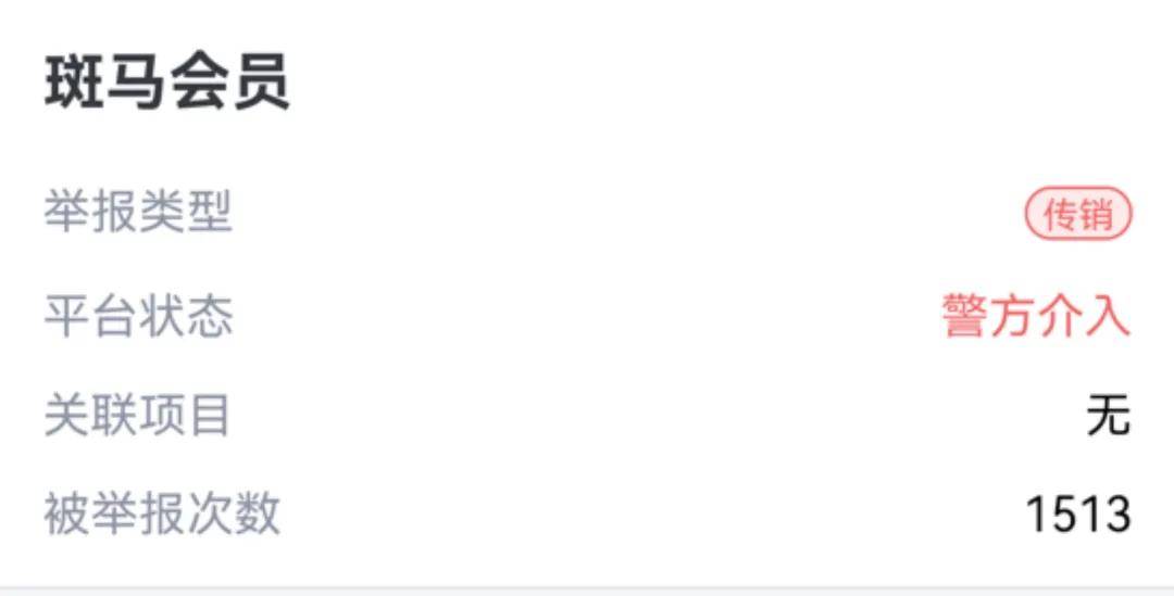 同时在腾讯灵鲲金融风险监管平台上,斑马会员被举报1500多次,举报类型已定性为传销,平台状态显示为“警方介入”,在黑猫投诉平台上,与斑马会员有关的投诉条数也已超过了400多条。