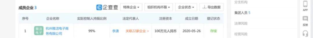 在企查查上,希柔显示隶属于杭州雅洁电子商务有限公司旗下的品牌生态链管理平台,与格家网络没有股权联系,但在实际控制人处显示为,格家网络创始人李潇占股99%,一切已然昭然若揭。
