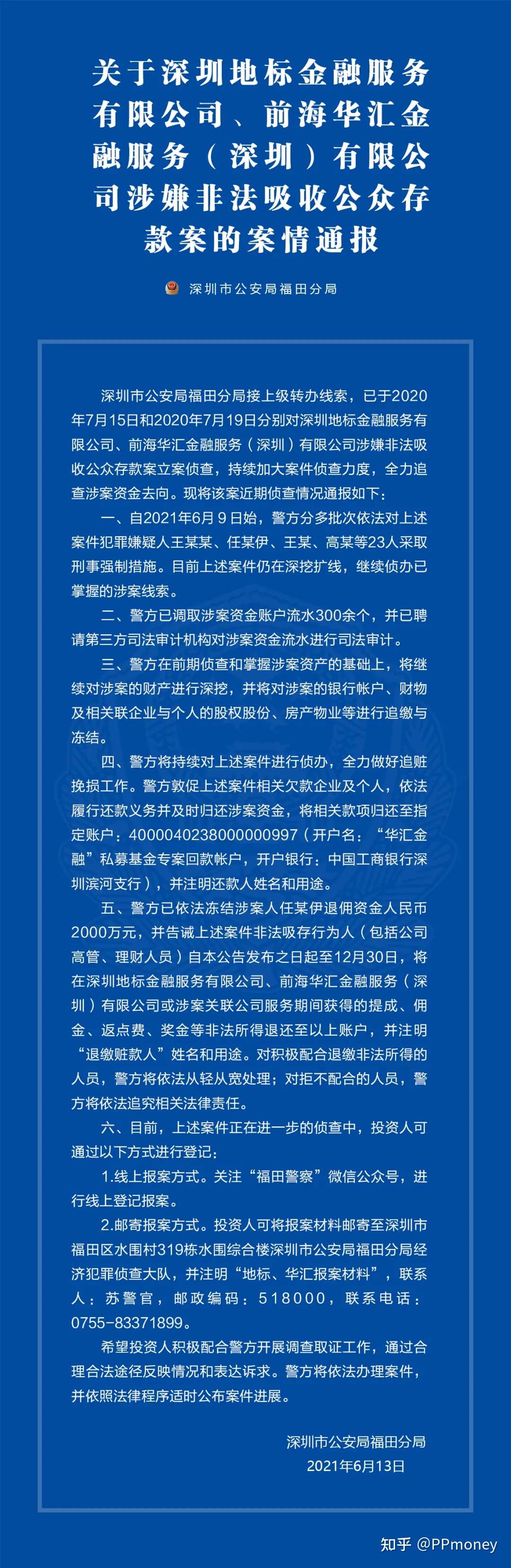警方已依法冻结涉案人任某伊退佣资金人民币2000万元,并告诫上述案件非法吸存行为人(包括公司高管、理财人员)自本公告发布之日起至12月30日,将在深圳地标金融服务有限公司、前海华汇金融服务(深圳)有限公司或涉案关联公司服务期间获得的提成、佣金、返点费、奖金等非法所得退还至以上账户,并注明“退缴赃款人”姓名和用途。对积极配合退缴非法所得的人员,警方将依法从轻从宽处理;对拒不配合的人员,警方将依法追究相关法律责任。