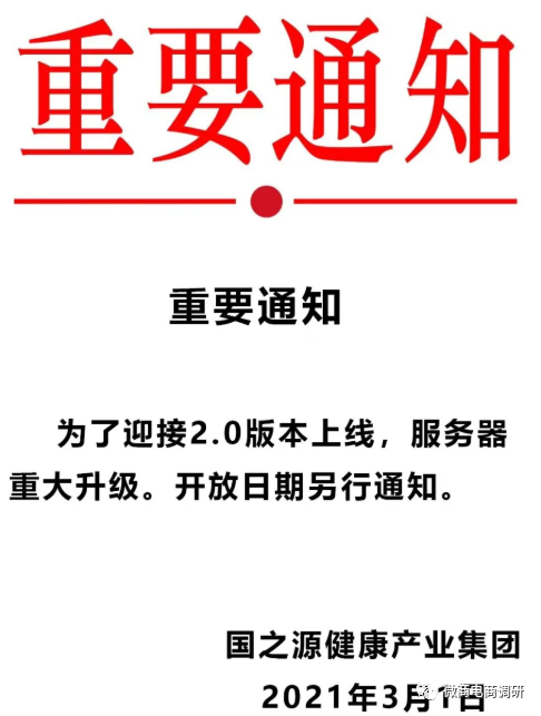 2021年春,在铺天盖地的“国之源涉传”新闻的舆论环境下,官方公众号“国之源投资”在3月1日发布了《紧急通知》,《通知》称:“为了迎接2.0版本上线,服务器重大升级。开放日期另行通知”。这则《通知》的落款是“国之源健康产业集团”,而在3月1日之后,公众号“国之源投资”再也没有更新过任何一条消息。