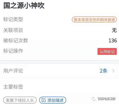 在眼下的腾讯灵鲲金融风险监管平台上,“国之源小神吹”这个关键词已经被标记了136次,主要标签有“发展下线拉人头”的字样。