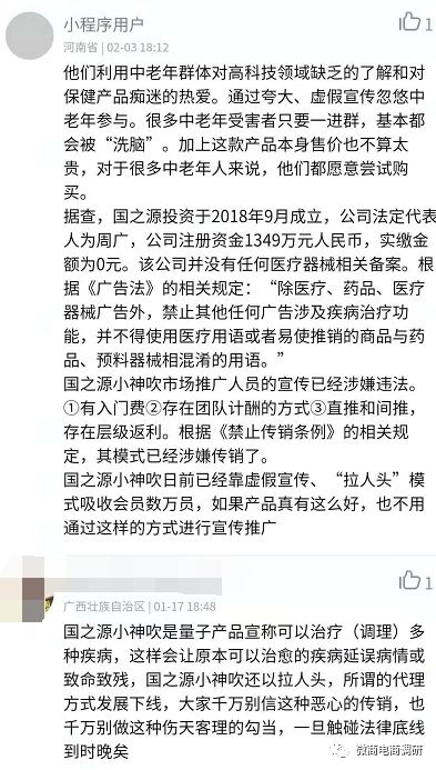 在由聚优传媒舆情监测中心与防传管家共同推出的《投诉举报统计》(统计来源于反传销网旗下各网络咨询平台及反传销网咨询部接到的关于对各类疑似资金盘,网络传销、非法直销、非法集资等情况登记)当中,“国之源小神吹”也已是榜上有名。