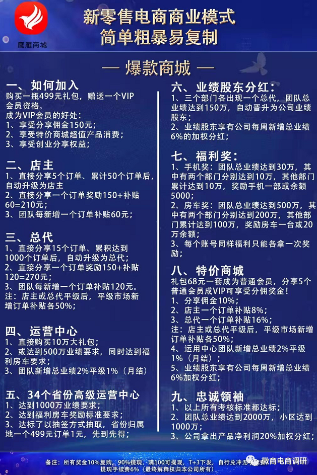 在国之源因涉传被查后,如今的鹰雁商城所推行的模式发生了哪些转变呢?首先看产品,在该平台上,国之源小神吹依旧被摆上了货架,其次看模式,据推广人员阿庆(化名)介绍,鹰雁商城的模式可以从以下九个方面解读: