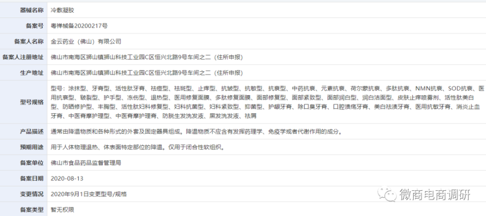 经查药智数据网站,我们发现该产品的器械名称为冷敷凝胶,产品描述为通常由降温物质和各种形式的外套及固定器具组成。降温物质不应含有发挥药理学、免疫学或者代谢作用的成分。预期用途:用于人体物理退热、体表面特定部位的降温。仅用于闭合性软组织。