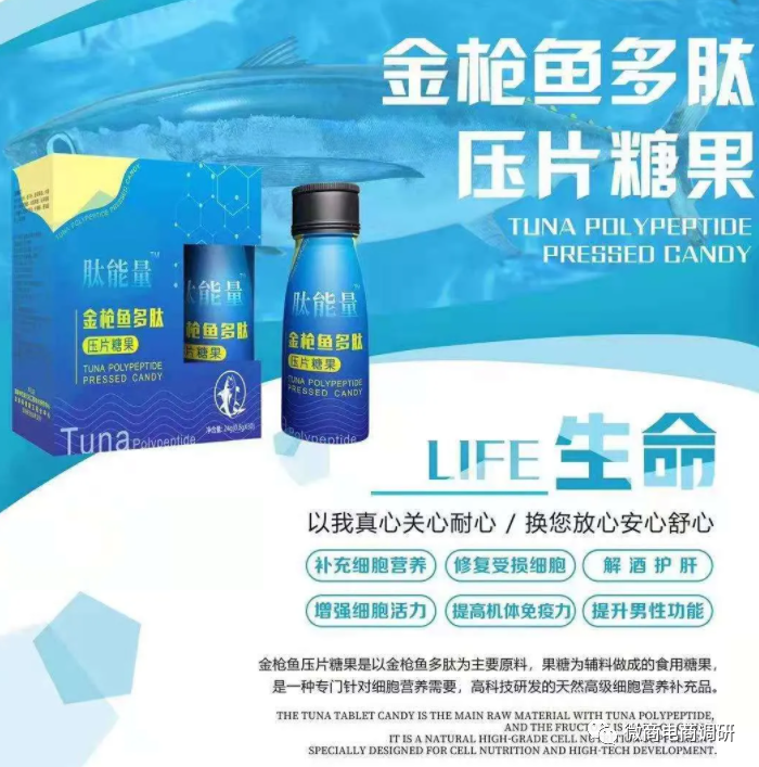 再比如“肽能量金枪鱼多肽压片糖果”,该产品被介绍为具有增强细胞活力、提高机体免疫力、提升男性功能等作用。