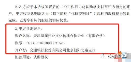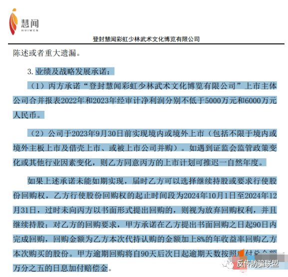 华时财讯根据该公司代持投资协议显示,目前该公司估值为96588.33万元人民币,原始股认购价为每股10元,指定收款账户为天津慧闻伟业文化传播合伙企业(有限合伙),所有投资协议均与此公司签订,客户认购的原始股竟由此公司代持。根据查询了解到河南慧闻少林武术文化实业集团有限公司对发售原始股主体公司持股66.7612%,其中余笛在河南慧闻少林武术文化实业集团有限公司持股0.6%,余笛又在天津慧闻伟业文化传播合伙企业(有限合伙)持股49%,相当于签合同代持原始股的公司只是间接持有登封慧闻彩虹少林武术文化博览有限公司极少股份。公司还承诺2023年9月30日前实现境内或境外主板上市,如未成功上市,公司可回购股权,同时给与8%的年化收益。同时还了解到该公司的原始股销售团队,天天在各类微信群、qq群、相关论坛等网络渠道发布大量高收益投资信息,从而引诱并吸纳不定向的各种市民。