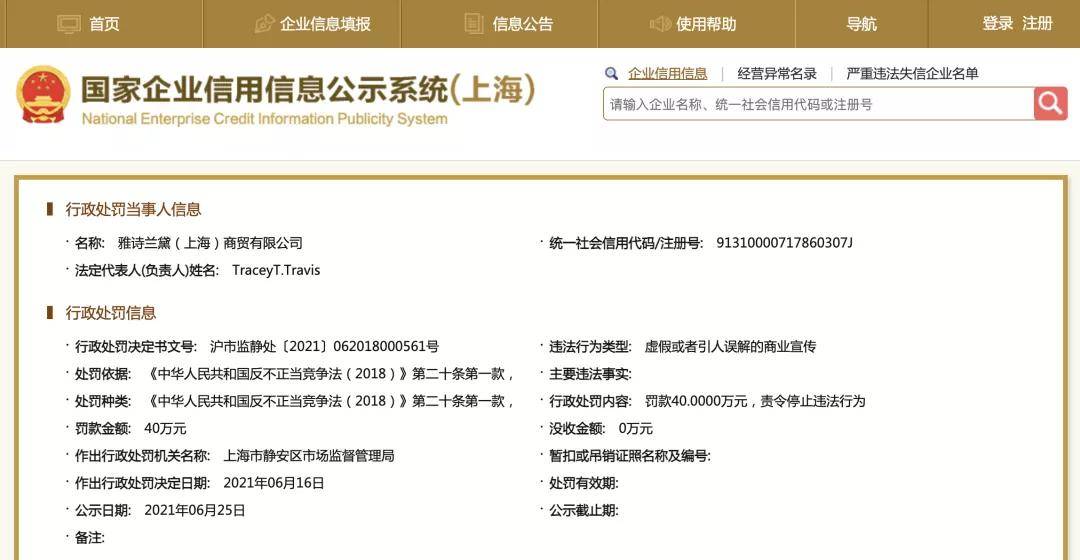 记者6月28日从企查查App了解到,近日,雅诗兰黛(上海)商贸有限公司新增一则行政处罚,处罚事由为虚假或者引人误解的商业宣传,处罚结果为罚款40万元,责令停止违法行为。