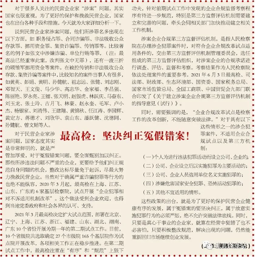 近年来,最高检和最高院多次发表意见,呼吁给予民营企业以平等待遇,扶持民营企业发展。