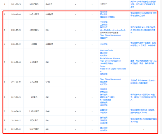 根据天眼查,在上市之前,每日优鲜共经历10轮融资,曾经获得中金、腾讯、高盛等知名机构投资。