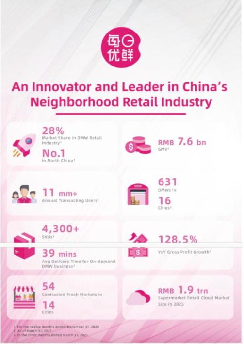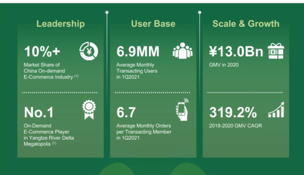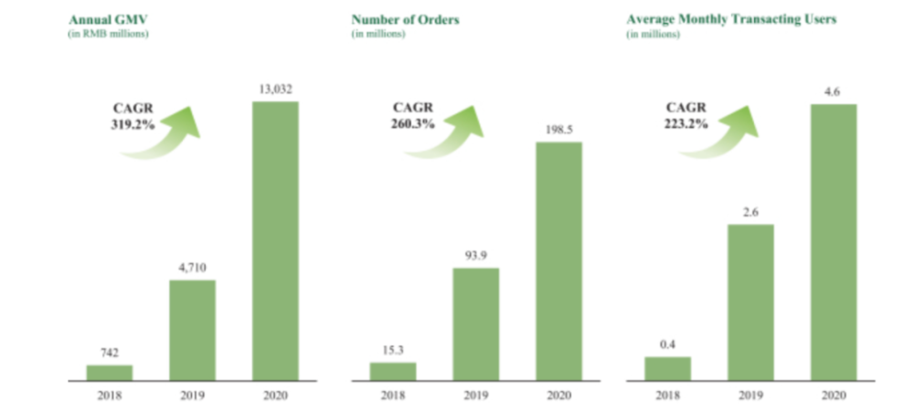 叮咚买菜GMV从2017年7.41亿元以319.2%的复合年增长率增长至2020年的130.3亿元人民币;2021年第一季度,公司GMV达到43.04亿元人民币。根据灼识咨询的数据,这一增速为国内前五大即时电商之首,同时远高于同期行业平均114.6%的复合增速。