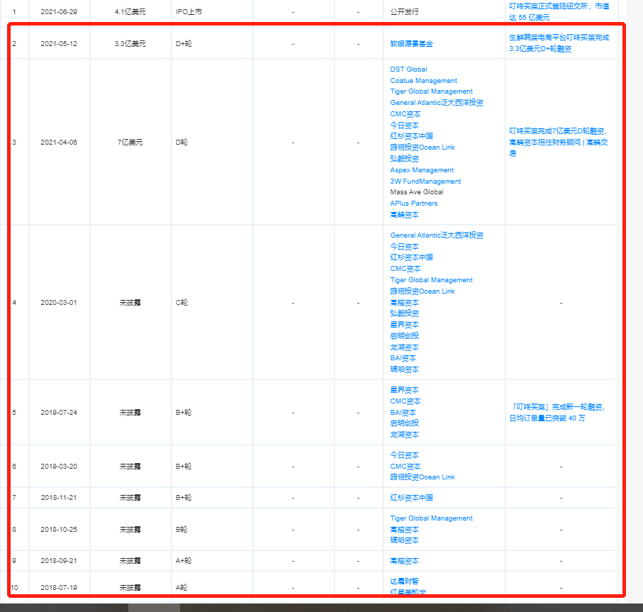 叮咚买菜也不甘示弱,上市前9轮融资,有红杉资本、软银、老虎等青睐。