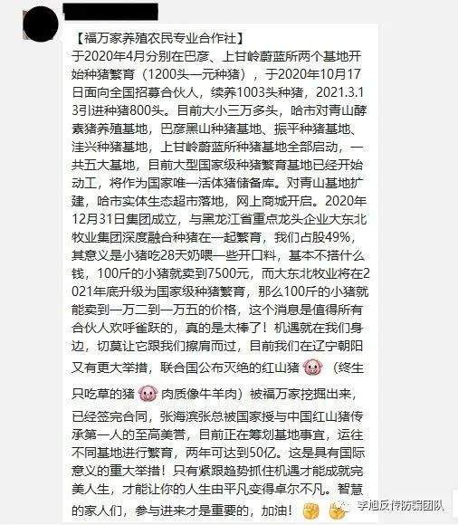 据福万家市场推广人员介绍,福万家合作社于2020年4月分别在巴彦、上甘岭蔚蓝所两个基地开始种猪繁育(1200头一元种猪), 于2020年10月17日面向全国招募合作伙伴,续养1003头种猪。2020年12月31日集团成立,与黑龙江重点龙头企业大东北牧业集团深度融合种猪在一起繁育,我们占股49%。