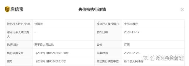 近日,微商电商调研在启信宝上发现一则失信被执行,其执行依据文号:(2019)赣0824刑初130号,案号:(2020)赣0824执238号,被执行人履行情况为全部为履行,执行法院为新干县人民法院,发布日期为2020年11月17日,失信被执行人为具体情形为有履行能力而拒不履行生效法律文书确定义务。