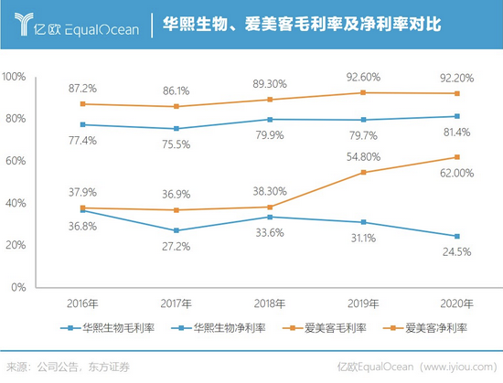 爱美客上市前,华熙生物是医美领域龙头,但爱美客上市后,市值一度突破千亿元,超过华熙生物。2020年其毛利率超过92%、净利率为62%,远超其他同行,媲美贵州茅台(1947.500, -35.40, -1.79%)2019年93.78%的毛利率。