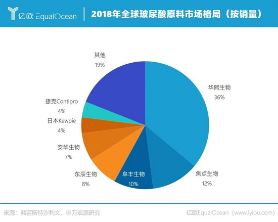 弗若斯特沙利文的报告显示,中国2018年玻尿酸原料的总销量已经占据全球总销量的86%,全球前五大供应商——华熙生物、焦点生物、阜丰生物、东辰生物、安华生物全部来自山东。