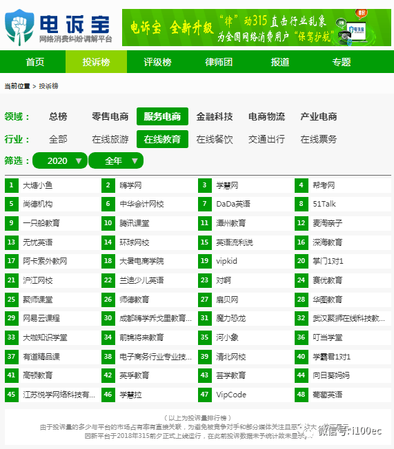 2020年至今,“电诉宝”受理投诉中涉及的在线教育平台有大塘小鱼、嗨学网、学慧网、帮考网、尚德机构、中华会计网校、DaDa英语、51Talk无忧英语、一只船教育、腾讯课堂、潭州教育、麦淘亲子、环球网校、英语流利说、深海教育、阿卡索、大暑电商学院、VIPKID、掌门1对1、沪江网校、兰迪少儿英语、对啊网、赛优教育、聚师课堂、师德教育、扇贝王、华图教育、网易云课程、魔力恐龙、大咖知识学堂、河小象、叮当学堂、清北网校、学霸君1对1、高顿教育、英孚教育、芸学教育、向日葵妈妈、VIPcode、葡萄英语。此前,日本村外教网、跟谁学、赞题库、小鹅通、斑马英语、51CTO学院、勤学网、叽里呱啦、建设工程教育网、家教平台、同桌100学习网、曼且思教育、起陆教育、德闲教育、过呗教育、一步教育也曾接到消费者的投诉。