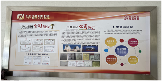 在一楼大厅,记者看到有关中盐集团与华盐集团之间关系的宣传简介。称:“华盐集团是中盐集团相关子公司合作商,负责中盐集团相关品牌及产品的宣传和推广。公司自建新零售销售系统,打造新一代“社群电商+实体连锁+乡村振兴+数字经济”的创新型综合平台”。