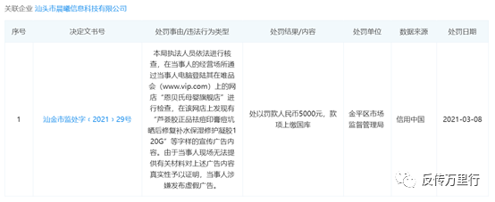 日前,反传万里行在信用中国上发现一则行政处罚通知,显示汕头市晨曦信息科技有限公司(简称晨曦信息科技)因广告违法行为被汕头市金平区市场监督管理局予以罚金8000元。