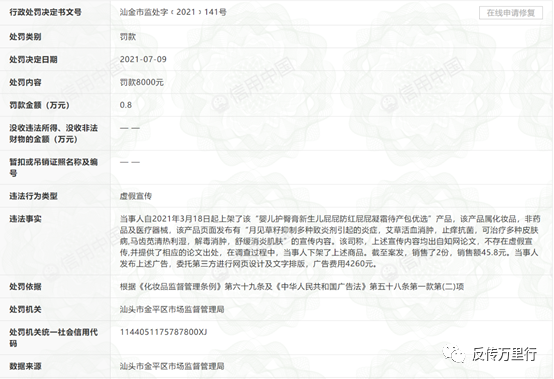 当事人自2021年3月18日起上架了该“婴儿护臀膏新生儿屁屁防红屁屁凝霜待产包优选”产品,该产品属化妆品,非药品及医疗器械,该产品页面发布有“月见草籽抑制多种致炎剂引起的炎症,艾草活血消肿,止痒抗菌,可治疗多种皮肤病,马齿苋清热利湿,解毒消肿,舒缓消炎肌肤”的宣传内容。该司称,上述宣传内容均出自知网论文,不存在虚假宣传,并提供了相应的论文出处,在调查过程中,当事人下架了上述商品。截至案发,销售了2份,销售额45.8元。当事人发布上述广告,委托第三方进行网页设计及文字排版,广告费用4260元。