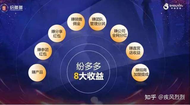 根据知情人士提供的纷多多的宣传资料显示,纷多多的8大收益分别为:赚产品、转参团红包、赚分享红包、赚销售佣金、赚团队管理分润、赚公司全网分红、赚直营店收益、赚招商加盟提成。