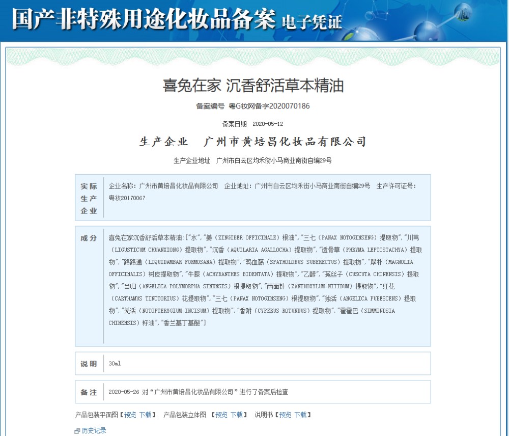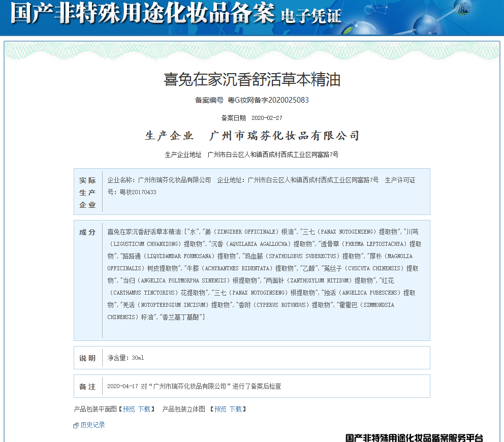 随后,社交财经在“国家非特殊用途化妆品备案服务平台”查询发现,“喜兔在家沉香舒活草本精油”分别有两家公司代工生产:广州市黄培昌化妆品有限公司与广州市瑞芬化妆品有限公司。