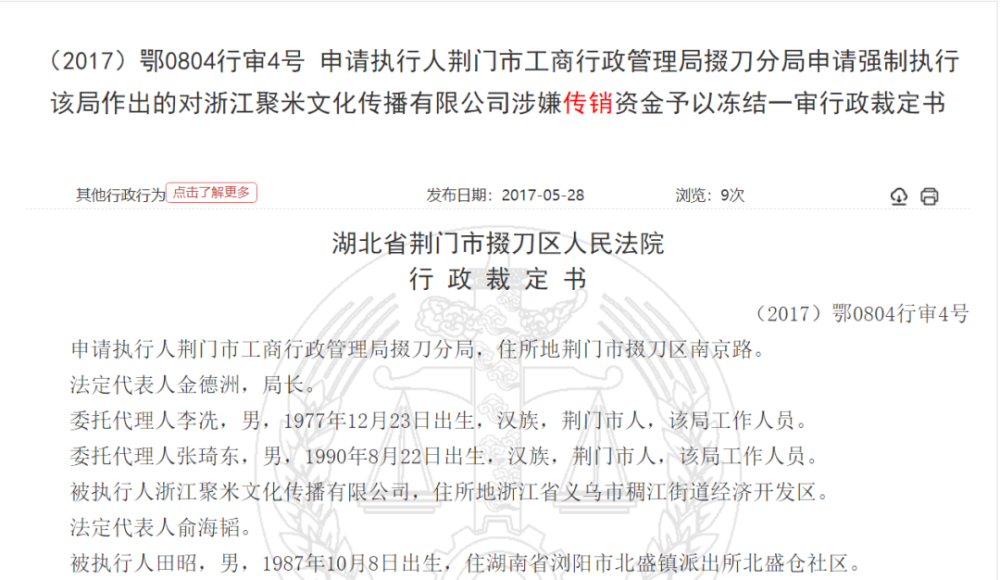 那么,“BIGTIME大时代”又是什么呢?“‘BIGTIME大时代’实际是一家微商品牌,其主要运营方是浙江聚米文化传播有限公司,实缴资本1000万元,其创始人是田昭、陈文庆、俞凌宇,也就是代理商耳熟能详的老光、老陈、凌宇。”据相关媒体人透露:“浙江聚米文化传播有限公司因虚假宣传与发布违法广告连续三年被义乌市市场监督管理局罚款,2017年因涉嫌传销被湖北省荆门市掇刀区人民法院冻结公司及主要人员的银行账户。”