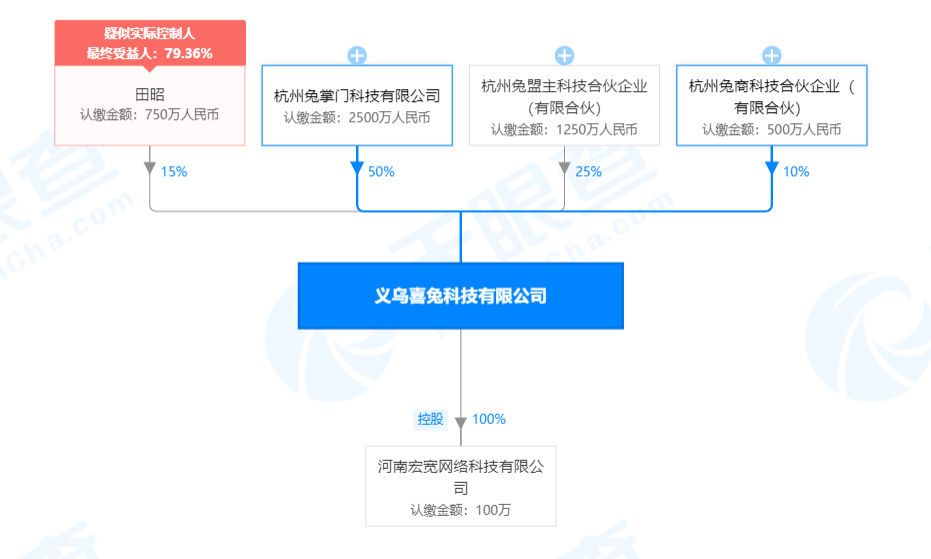 据天眼查APP显示,“喜兔在家”商标属于义乌喜兔科技有限公司,该公司成立于2019年4月17日,注册资本为5000万元,田昭担任法人、执行董事兼总经理。该公司最大股东是杭州兔掌门科技有限公司,持股50%,杭州兔盟主科技合伙企业(有限合伙)持股25%,田昭持股15%,杭州兔商科技合伙企业(有限合伙)持股10%。