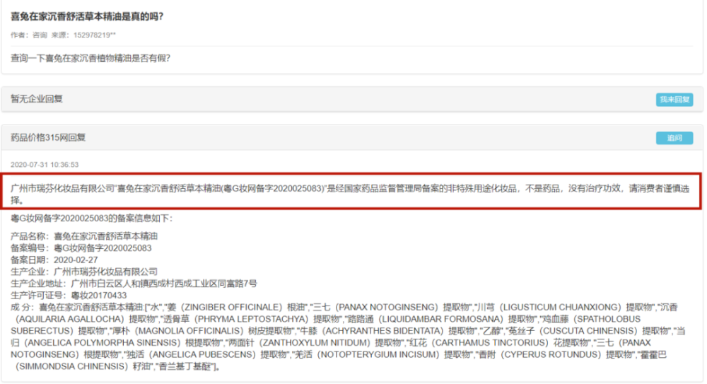 但社交财经注意到,今年7月有网友咨询“药品价格315”:喜兔在家沉香植物精油是否有假?对此,药品价格315网回复道:广州市瑞芬化妆品有限公司“喜兔在家沉香舒活草本精油(粤G妆网备字2020025083)”是经国家药品监督管理局备案的非特殊用途化妆品,不是药品,没有治疗功效,请消费者谨慎选择。