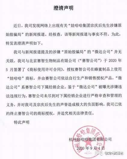 到了2020年9月4日,娃哈哈便发布《澄清声明》,《声明》称:2020年5月,娃哈哈与北京赛智生物制品有限公司签署了《商标使用许可合同》,授权赛智公司在蜂蜜制品上使用“娃哈哈”商标,并由赛智公司依法自行生产和销售授权产品,“微达公司”系赛智公司下属经销企业。
