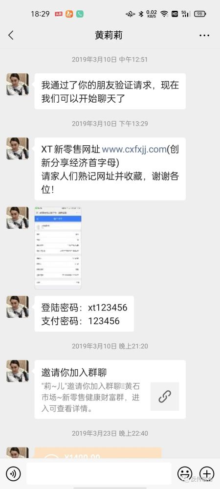 在2019年3月10日在湖北省黄石市万达广场旁边的一个公寓里被一个叫黄莉莉(不知道是不是真名,但我可以找到她本人)的女的以“新零售投资”拉人头式“投资受益模式”向她转账17500(1万7千5百元)钱,用银行卡刷的她的pos机,刷完之后就加了她的微信,她把我拉进去一个会员群。