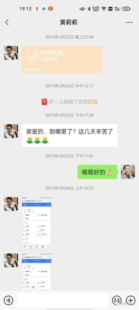 这是我转账1400元给她的截图