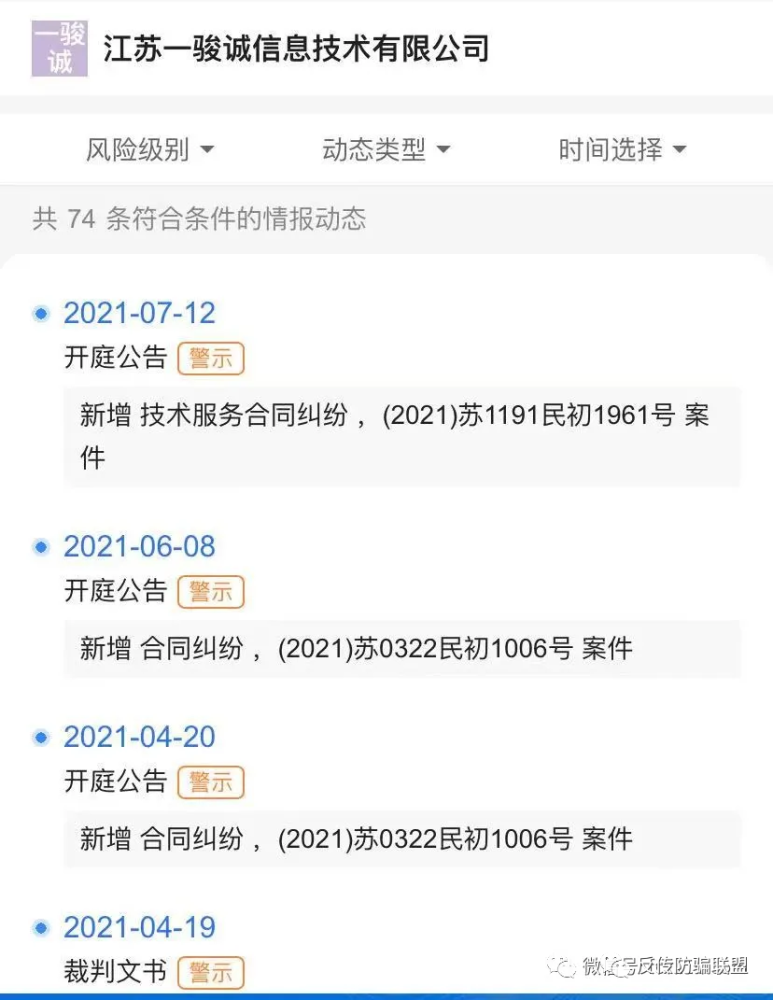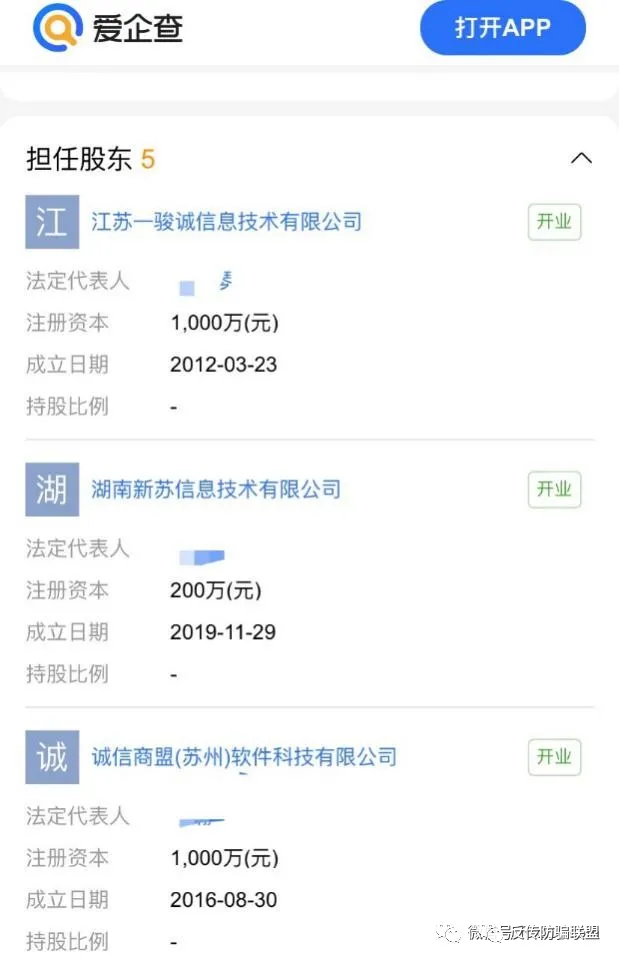 经企查查查询,这个自称苏州嗨皮码信息科技有限公司项目负责人的何某名下五家类似企业,一家营业执照吊销,一家注销,剩余还有三家开业公司人员无一人交社保,尤其是名下一家名叫“江苏一骏诚信息技术有限公司”的公司在本月7月12日还在因为此类服务合同纠纷开庭!试问国家有这样的公司存在是否还有保障?他们是不是在利用法律的漏洞来去牟利值得每一个人深思!