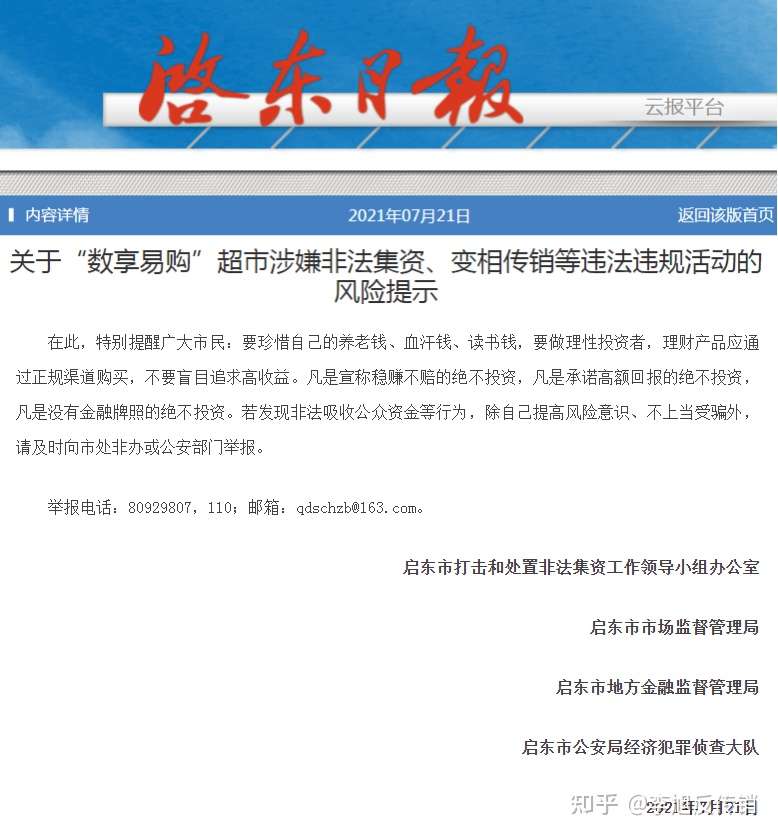 现市处非办、市市场监管局、市地方金融监管局、市公安局经侦大队联合对“数享易购”超市和“博蓝共享”平台向市民进行风险提示,“数享易购”超市及其另行注册成立的“南通市数享易购商贸有限公司”、“博蓝共享”平台设立方均是普通工商企业(个体工商户),均未取得中央金融管理部门或者地方金融监管部门批准(含备案),不具备从事吸收存款、发放贷款等业务资质。
