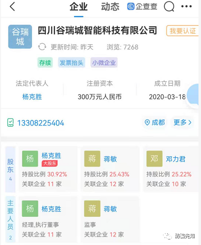 据企查查显示:四川谷瑞城智能科技有限公司(以下简称:谷瑞城),成立于2020年3月18日,注册资金300万元人民币,实缴0元,法定代表人杨克胜,监事蒋敏。全国有多家名为谷瑞城的企业,这些企业的股东均有交叉持股的现象。