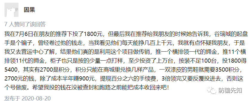 据知乎网友表示:我在7月6日在朋友A的推荐下投了1800元,但最后我在推荐给我朋友B的时候,她告诉我,谷瑞城的起盘手是个骗子,曾经卷过他的钱走,当我看见他们每天能挣几百上千元,我就有点怀疑我朋友A,于是我又去营运中心了解,结果他们真的是利用这个项目做传销,推一个横排领一代的拥金,推11个横排领11代的拥金,柜子也只是按的少量一点打样,至少投资了上万台,按装不足100台,投1800得5400,其实有2700是积分,积分只能在商城里兑换几样产品,一双漆皮的男鞋就需要3500积分,2700元的钱,除了成本半年赚900元,提现百分之六的手续费,3倍领完又要反覆投进去,否则这个号做废。希望我投的钱在没被查封和跑路之前能把成本收回来吧!